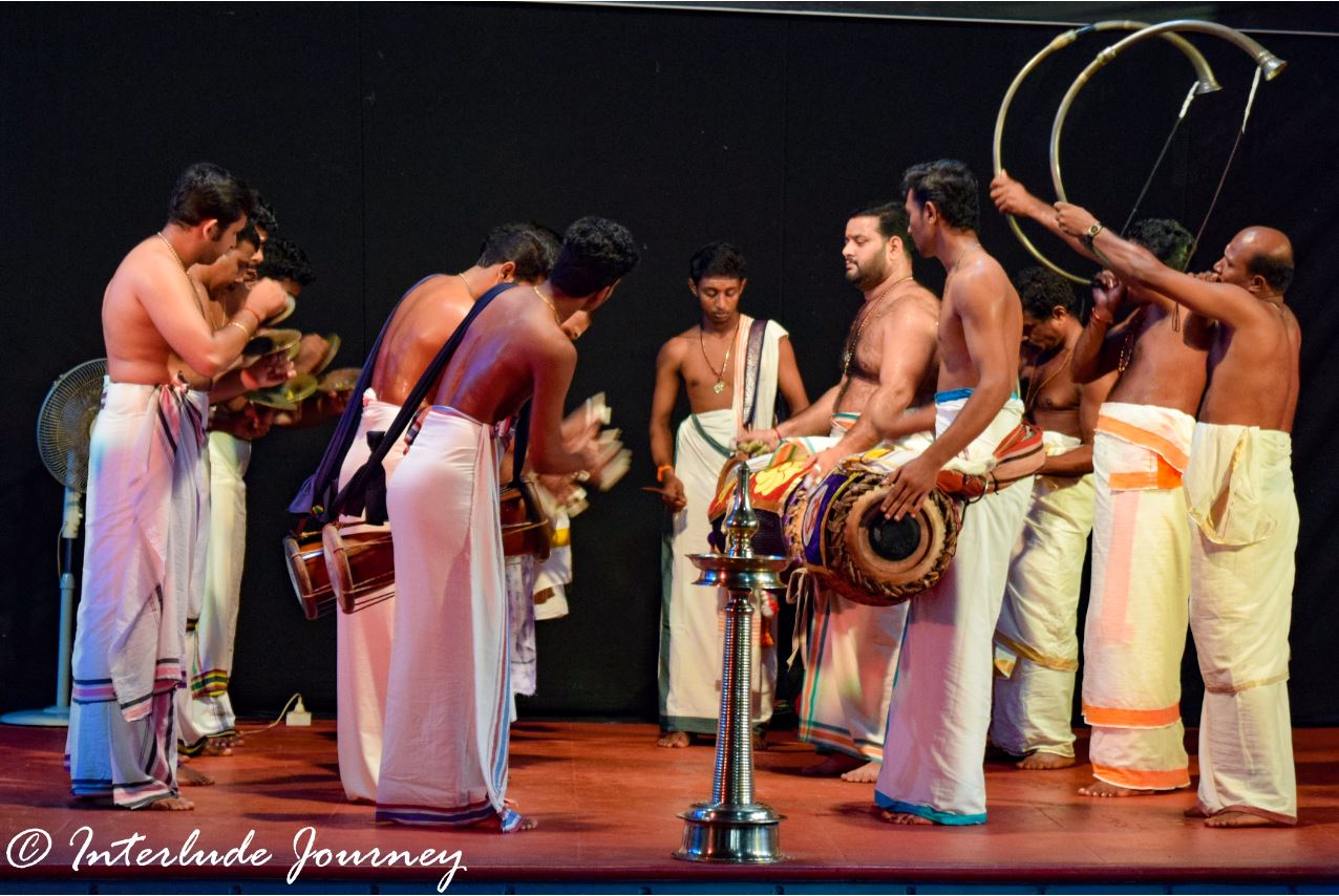 Just when we were brooding over our lost opportunity to visit the Kerala Kalamandalam, we found ourselves stood in front of another school of performing arts. As we entered the gates, we saw about a hundred people seated in an open auditorium enjoying a performance on the stage. Their heads nodding as if in a trance to the rhythm of the beats from Chenda (a cylindrical percussion instrument used in southern states of India) as the students performed on stage. The entire arena reverberated with the percussive beats.
